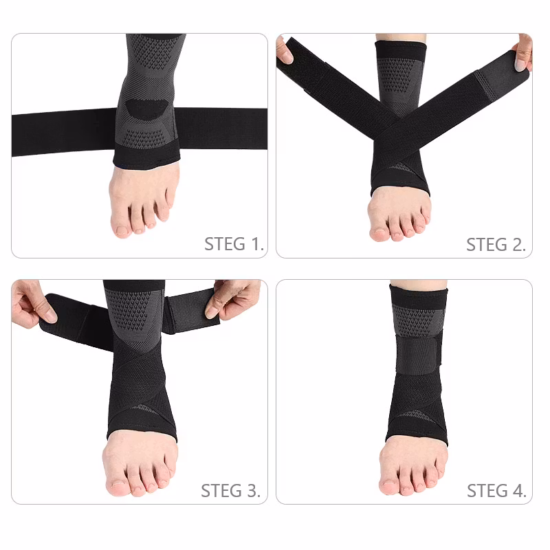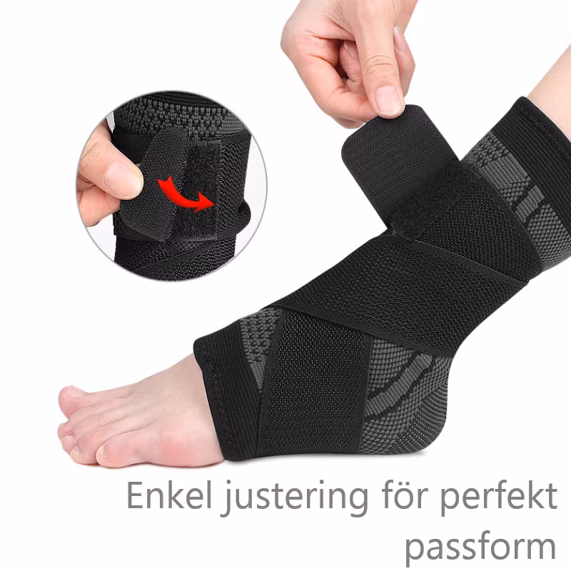 Ett stabiliserande fotstöd med två elastiska band för skönt stöd vid olika aktiviteter och för att förebygga skador i ankeln och fotlederna. Materialet är av mycket hög kvalitet och vävt i 3 dimensionellt tyg med flera förstärkningar där foten och ankeln behöver det som mest. Detta mer avancerade fotledsstödet håller hela fotleden på plats när du utövar intensiva aktiviteter, sporter. Du reglerar själv hur hårt det sitter tack vare de elastiska spännremmarna och kardborredelen. Fotledsstödet kan användas över andra strumpor och i de allra flesta skorna. Materialet låter huden andas och kan därför användas även under varmare dagar. Kompressionen gör att foten får bättre blodcirkulation, stödjer upp ankeln och hälsenan vid exempelvis vrickad fot och förebygger också framtida stukningar genom att den håller ankeln och foten stabilt.