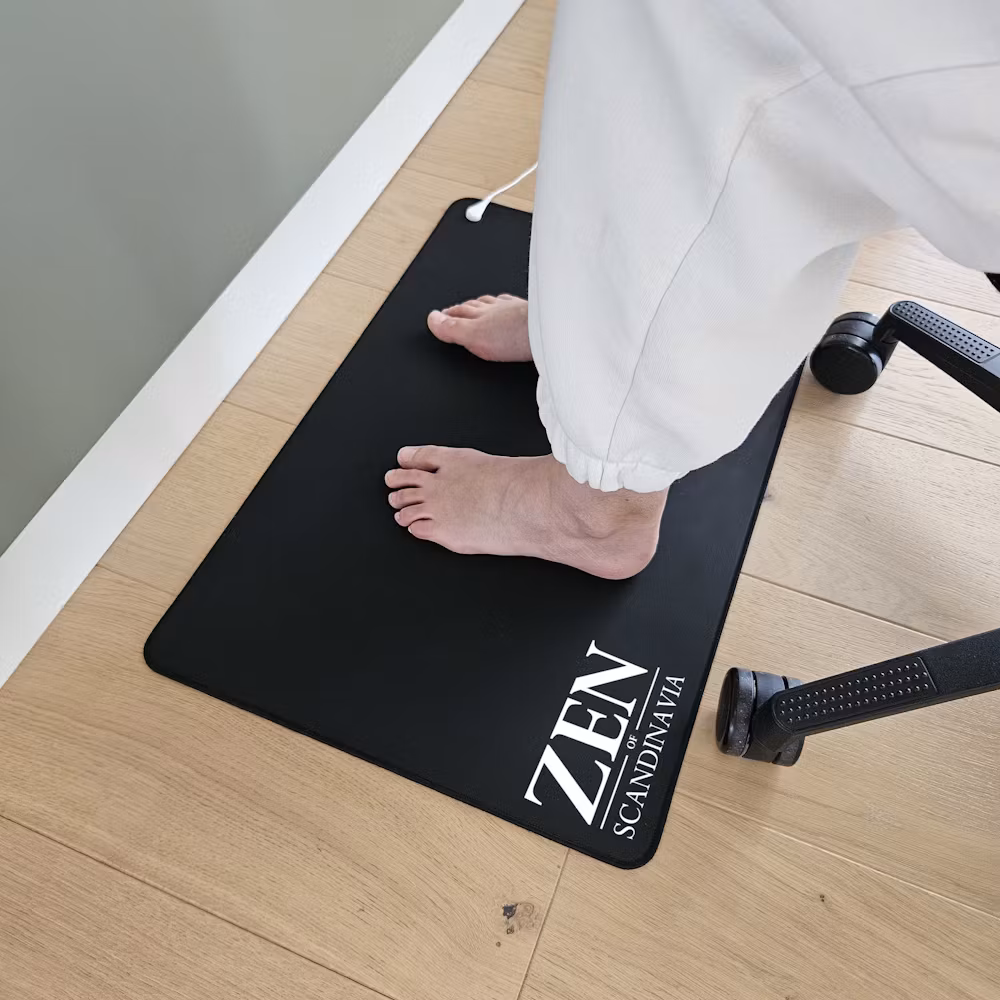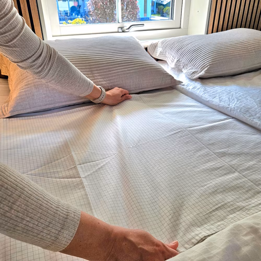 Både lakanet och mattan ansluts till jordningen i ett vanligt EU-vägguttag. När du ligger eller har fötterna mot produkterna leds jordens fria elektroner in i kroppen, vilket balanserar ditt elektriska system och hjälper kroppen att släppa överskott av inflammation och stress – precis som när du går barfota i naturen.