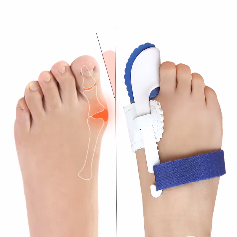 Ett par korrigerande stöd för att justera stortåleden vid hallux valgus. Minska smärta och obekvämhet med denna stödskena som du själv enkelt kan justera och fästa tack vare kardborreband.