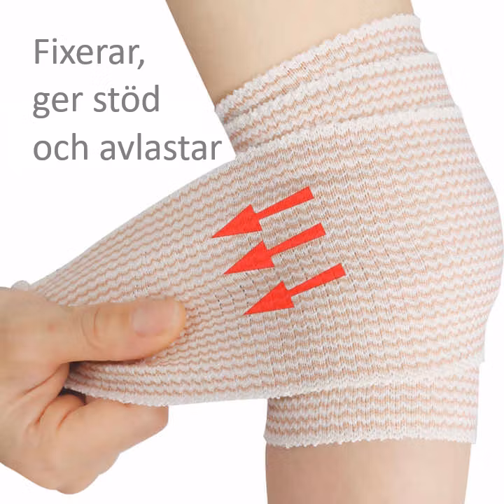 Det elastiska bandaget fixerar, avlastar och ger stöd åt det drabbade området.