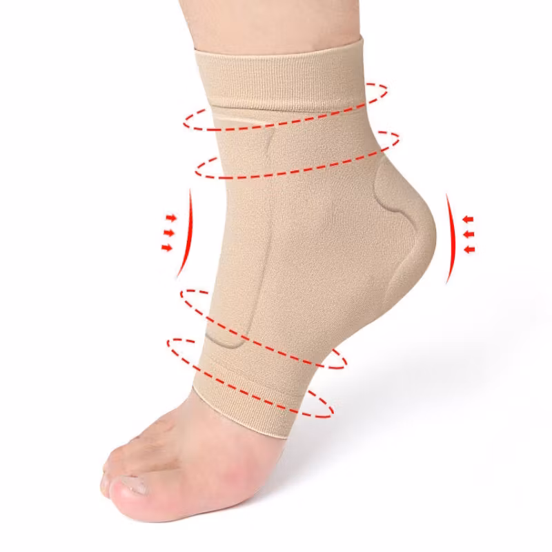 Detta är ett par strumpor i skön och mjuk spandex som har en inbyggda silikonkuddar som skyddar och avlastar hälen baktill och undertill samt längsmed hela framsidan. Minskar besvär som t.ex. hälsporre, fotödem, ont i ankeln. Kan användas under andra strumpor och i de flesta skor.