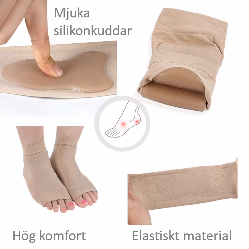 Ett par väldigt sköna strumpor med mjuka och avlastande silikonkuddar vid hälen samt överdelen av foten vid problem med exempelvis, hälsporre, ont i hälen, sprucken häl, fotödem och ont i övedelen av foten. Dessa mjuka strumpor skyddar hälens baksida, hälens undersida och ovanpå foten. När du bär skor så kan dessa punkter triggas och göra ont. Men med dessa strumpor känns allt bekvämt på foten och de inbyggda silikonkuddarna skyddar större delen av foten och bäddar in den behagligt.