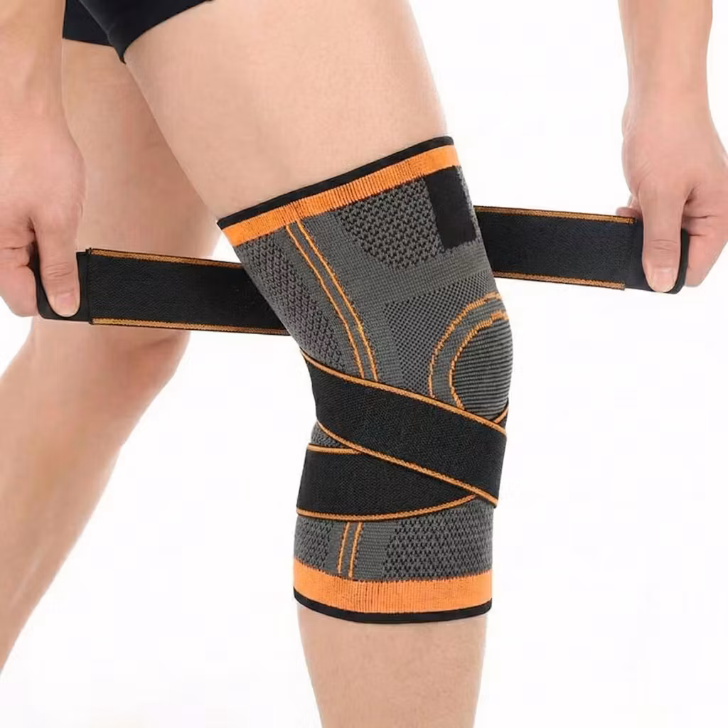 Knäskydd med stöd, kompression & spännrem, SVART/ORANGE