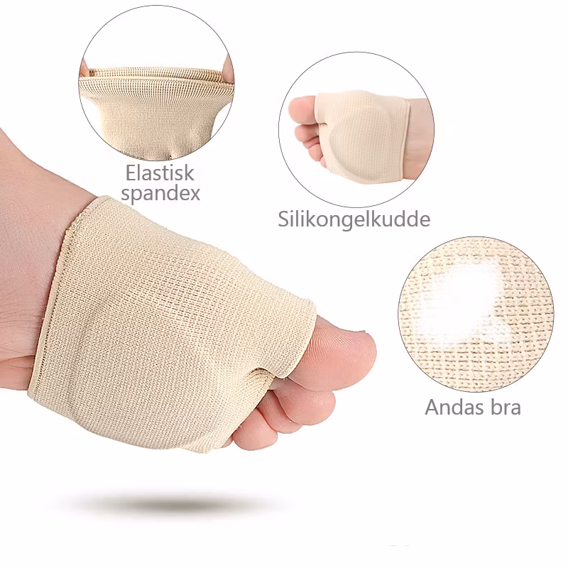 Ett par mjuka och sköna framfotsskydd med silikongelkudde vid problem med mortons neurom, en framfotssmärta som uppstår när en nerv kommer i kläm. Framfotsinläggen kan också användas när man har problem med hammartå, då strumpan håller tårna på plats.