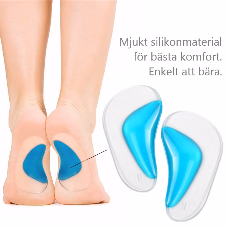 Bekväm gelkudde som ger omedelbar stötdämpning och hålfotsstöd vid plattfot. Skoinlägget är av silikon och självhäftande vilket gör det lätt att placera i skor för stöd som alltid finns på plats utan att röra på sig. Materialet är slittåligt och lätt att tvätta av om så behövs.
