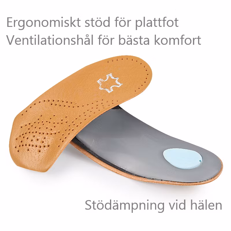 Ergonomiskt stöd för plattfot och hälsporre! Detta exklusivare skoinlägg har en övre yta i ventilerande läder som ger foten en optimalare fothälsa. Tack vare den extra höga förhöjningen vid fotvalvet låter den foten inta en bättre position och minska smärta från nedsjunket fotvalv. Den inbyggda latex-kudden vid hälen lindrar smärta från plantar fasciit (hälsporre).