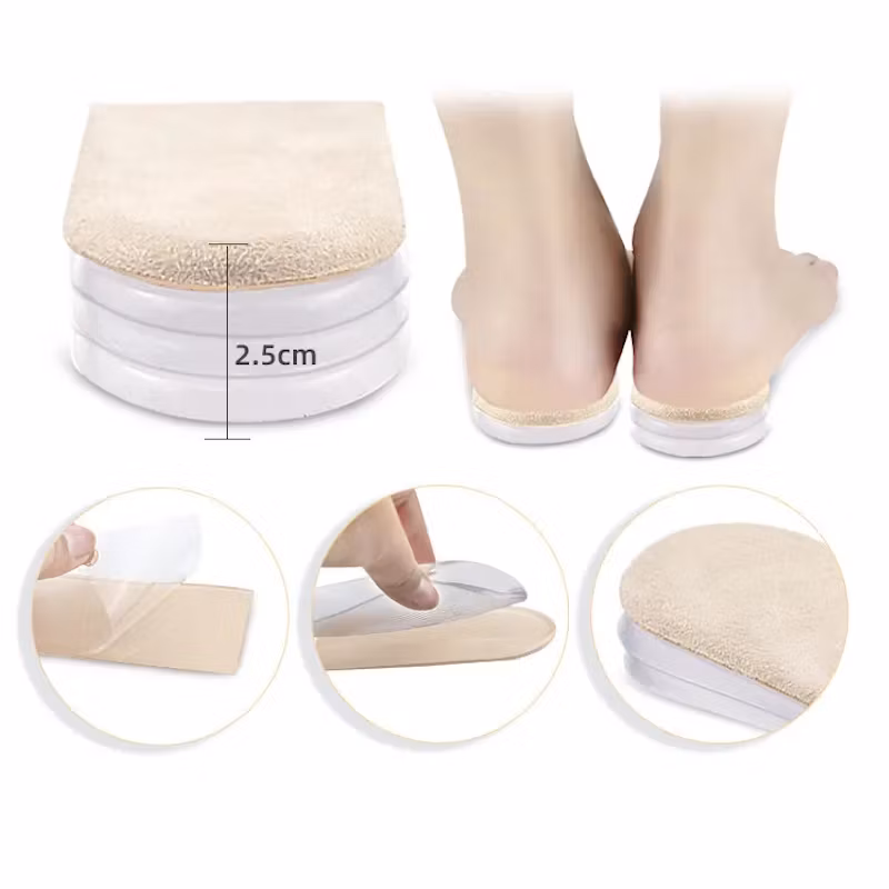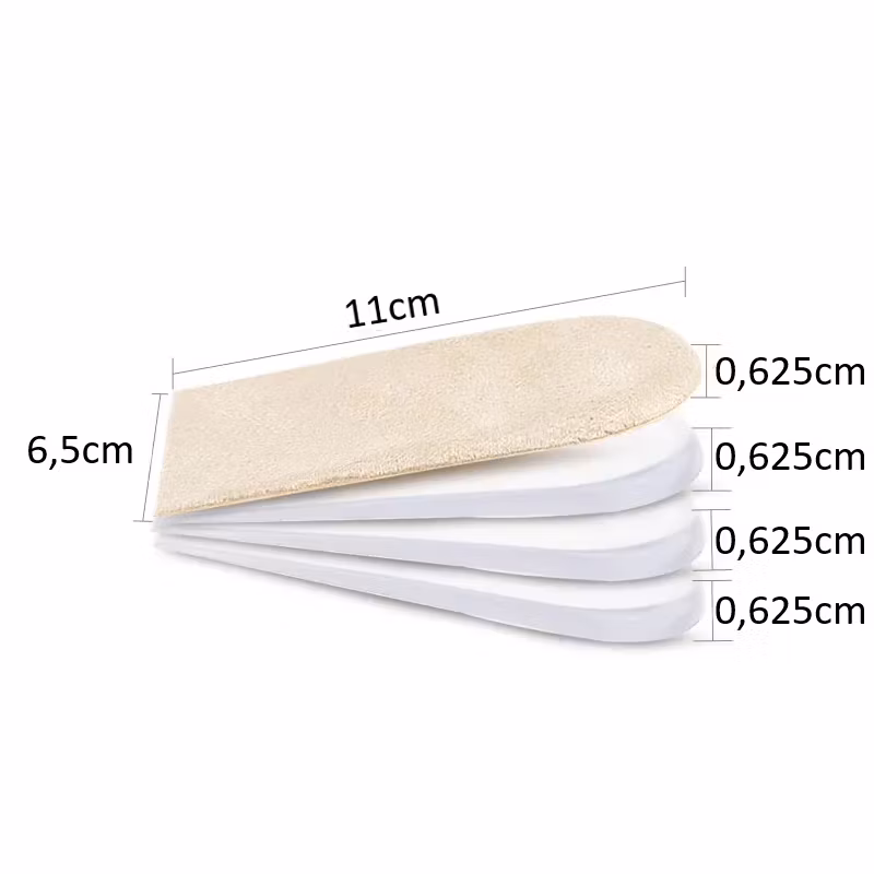 Uppgradera din komfort och längd med våra hälinlägg med justerbar höjd. Varje set innehåller fyra separata inlägg (0,625 cm vardera) som enkelt staplas för att ge önskad höjd. Den självhäftande undersidan håller inläggen stadigt på plats i skon, samtidigt som den mjuka gel- och mockaytan (suede) ger en skön och dämpande känsla hela dagen.