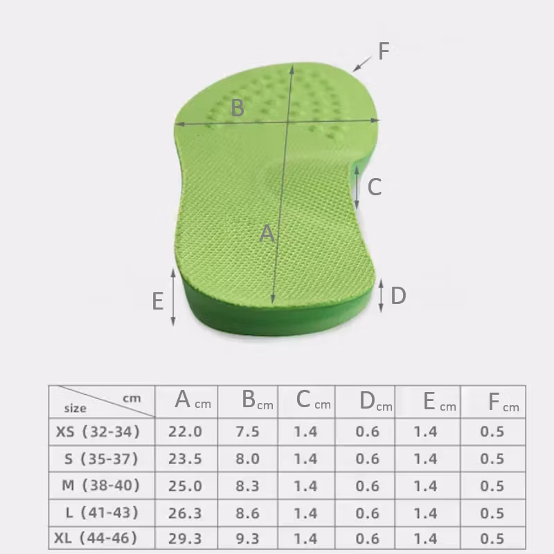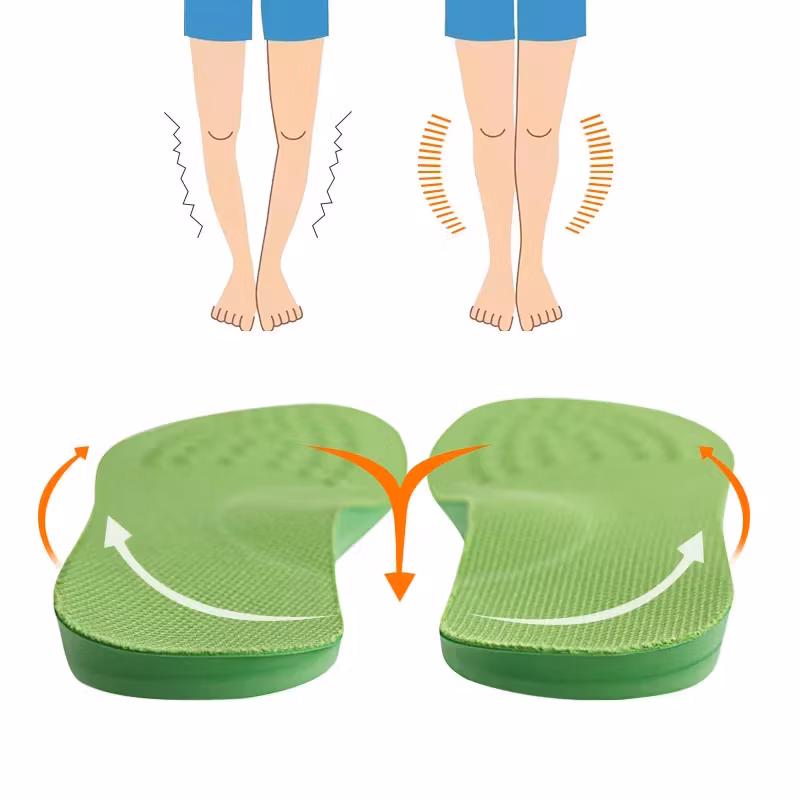Ett par skoinlägg mot hjulbenthet som är utformade för att hjälpa till att korrigera benställningen och minska belastningen på knän och höfter. Inläggen ger ett riktat stöd som förbättrar kroppshållningen och främjar en mer naturlig gångstil – perfekt för dig som upplever smärta eller snedbelastning.