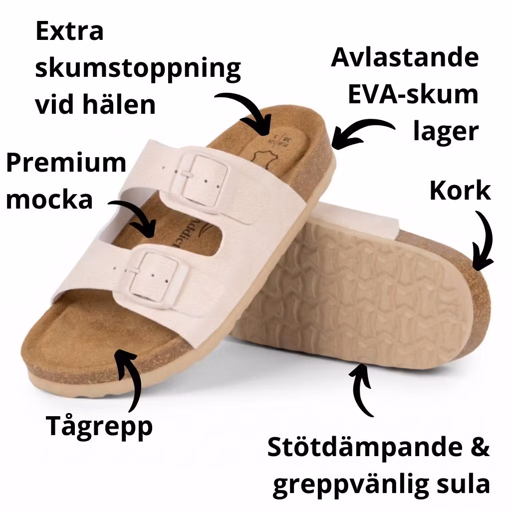Dessa naturvita damsandaler är det perfekta valet för dig med trötta och ömma fötter, som vill ha både stil och komfort – oavsett om du är hemma, på jobbet eller ute i solen.